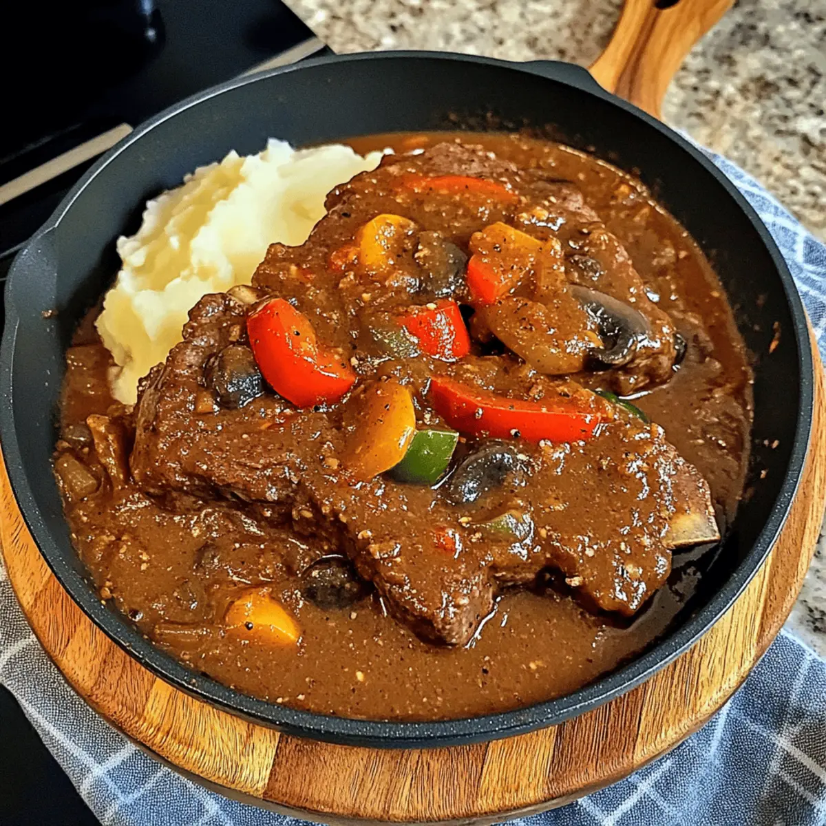 Aller à la recette Imprimer la recette« Vous avez déjà eu cette envie irrésistible de vous plonger dans un plat réconfortant ? Aujourd’hui, je vous invite à découvrir le bifteck suisse, une véritable madeleine de Proust culinaire qui réchauffe le cœur et l’âme. Ce plat classique, mijoté longuement avec des champignons savoureux, des poivrons croquants et des oignons caramélisés dans une sauce tomate beefy, est un bonheur à chaque bouchée. En plus d’être très facile à réaliser, il ne pèse pas sur le budget, ce qui en fait un choix parfait pour un dîner en famille. Préparez-vous à revivre ces dîners chaleureux qui rappellent les repas faits maison des jours passés. Quelles sont vos façons préférées de déguster le bifteck suisse ? » Pourquoi le bifteck suisse est-il si réconfortant ? Émotions chaleureuses: Le bifteck suisse évoque une nostalgie qui réchauffe les cœurs. Son goût riche et savoureux vous transporte instantanément vers des souvenirs d’enfance, rassemblant la famille autour de la table. Facilité de préparation: Avec des étapes simples, même les débutants en cuisine peuvent préparer ce plat sans stress. Budget-friendly: Économique, il convient à tous les budgets tout en étant délicieux. Polyvalence parfaite: Servez-le avec des pommes de terre, du riz ou des nouilles pour un repas adapté aux préférences de chacun. Aromas irrésistibles: Imaginez la cuisine embaumée d’une sauce tomate épicée qui se développe lentement en mijotant… Une invitation à table ! Plats réconfortants: Ce classique allie la douceur des légumes à la richesse de la viande, offrant un véritable plat réconfort. Ingrédients du Bifteck Suisse • Pour découvrir les merveilles du bifteck suisse, voici les ingrédients dont vous aurez besoin. Pour le Steak Bifteck coupé en dés – Une coupe de viande économique qui peut être remplacée par du steak de ronde émincé, préalablement attendri. Farine tout usage – Permet de donner une croûte savoureuse au steak et d’épaissir la sauce. Sel & Poivre noir – Indispensables pour relever les saveurs du plat. Ail granulé – Ajoute une profondeur de goût. L’ail frais peut être utilisé pour une saveur plus prononcée. Huile (avocat ou légumes) – Pour faire dorer le steak et faire revenir les légumes. Pour la Sauce Oignon – Apporte douceur et profondeur grâce à sa caramélisation. Céleri – Offre des notes terreuses et une belle texture. Poivron vert – Ajoute une touche de douceur et de couleur, équilibrant la richesse de la sauce. Champignons cremini ou de Paris – Renforcent le caractère et la saveur de ce plat réconfortant. Pâte de tomate – Un booster de goût concentré qui approfondit la sauce. Tomates en dés – Base de la sauce tomate, ajoutant acidité et douceur. Bouillon de boeuf – Constitue la base de la sauce, apportant une saveur de boeuf riche. Sauce Worcestershire – Introduit une complexité aigre-douce. Thym séché – Apporte chaleur et équilibre aromatique. Sucre – Équilibre l’acidité des tomates pour une saveur harmonieuse. Graines de céleri (facultatif) – Renforce le goût du céleri. Fécule de maïs et eau – Utilisées comme mélange pour épaissir la sauce. Instructions pour le Bifteck Suisse Savoureux en Sauce Tomate Step 1: Préchauffez le four Préchauffez votre four à 160°C (325°F) pour assurer une cuisson douce et uniforme du bifteck suisse. Pendant que le four chauffe, vous pourrez préparer la viande et les légumes, et ainsi optimiser votre temps en cuisine. Step 2: Préparez le mélange de farine Dans un sac refermable, combinez de la farine tout usage, du sel, du poivre noir et de l’ail granulé. Ajoutez les dés de bifteck et secouez vigoureusement pour bien les enrober. Cette étape créera une croûte délicieuse et aidera à épaissir votre sauce à la fin. Step 3: Faites dorer le bifteck Dans une grande casserole en fonte, chauffez de l’huile à feu moyen. Une fois chaude, ajoutez le bifteck en dés et faites-le dorer pendant environ 3 à 4 minutes de chaque côté jusqu’à ce qu’il soit bien marqué et que des sucs se soient formés. Retirez-le sur une assiette et réservez. Step 4: Faites revenir les légumes Dans la même casserole, ajoutez l’oignon, le céleri, le poivron vert et les champignons. Faites sauter pendant 6 à 7 minutes, ou jusqu’à ce qu’ils soient bien ramollis et légèrement dorés. Peu avant la fin de la cuisson, incorporez l’ail et la pâte de tomate, en laissant cuire encore une minute. Step 5: Préparez la sauce Ajoutez les tomates en dés, le bouillon de boeuf, la sauce Worcestershire, le thym séché, le sucre et les graines de céleri (si vous les utilisez) dans la casserole. Remuez bien pour mélanger les saveurs. Vous créez ainsi la base de votre sauce savoureuse pour le bifteck suisse. Step 6: Cuisez au four Remettez les morceaux de bifteck dans la casserole, en vous assurant qu’ils sont immergés dans la sauce. Couvrez la casserole et enfournez pour une cuisson lente, pendant 1h30 à 2h. La viande doit devenir fondante et se détacher facilement à la fourchette. Step 7: Épaississez la sauce Une fois cuit, retirez délicatement le bifteck de la casserole. Dans un petit bol, mélangez la fécule de maïs avec un peu d’eau pour créer une pâte, puis incorporez-la à la sauce. Portez à ébullition tout en remuant continuellement jusqu’à ce que la sauce épaississe. Step 8: Servez Servez le bifteck suisse accompagné de la sauce sur une base de purée de pommes de terre, de nouilles ou de riz. Apportez une belle présentation en ajoutant quelques légumes pour une touche colorée. Ce plat réconfortant ne manquera pas de ravir tous les gourmands à votre table. Conseils de Conservation pour le Bifteck Suisse Réfrigérateur : Conservez les restes de bifteck suisse dans un récipient hermétique pendant jusqu’à 3 jours. Cela préserve la tendresse de l