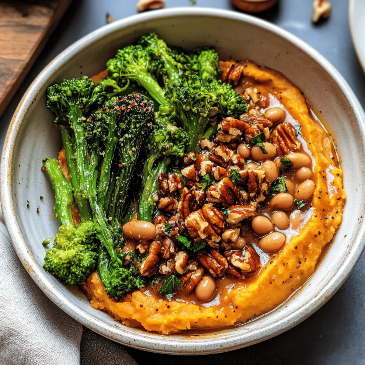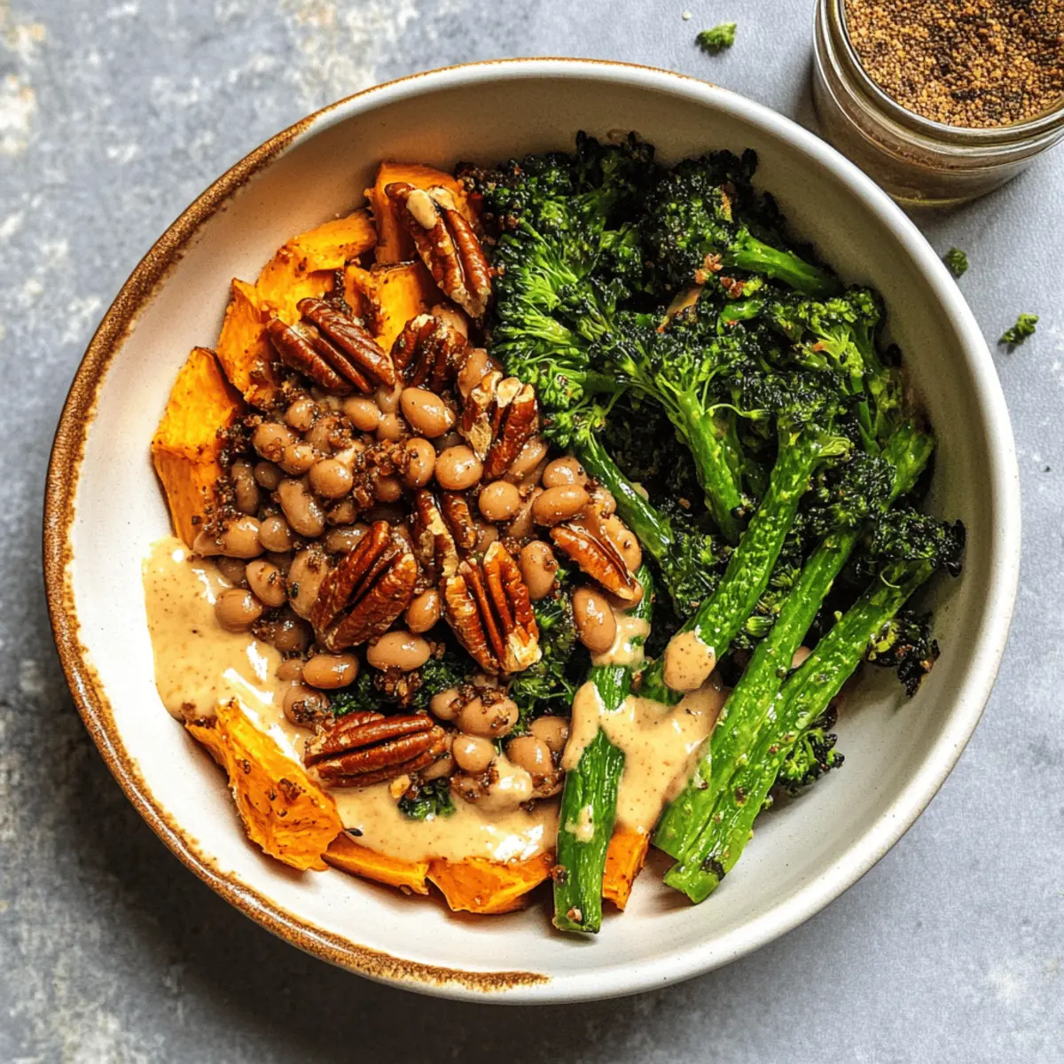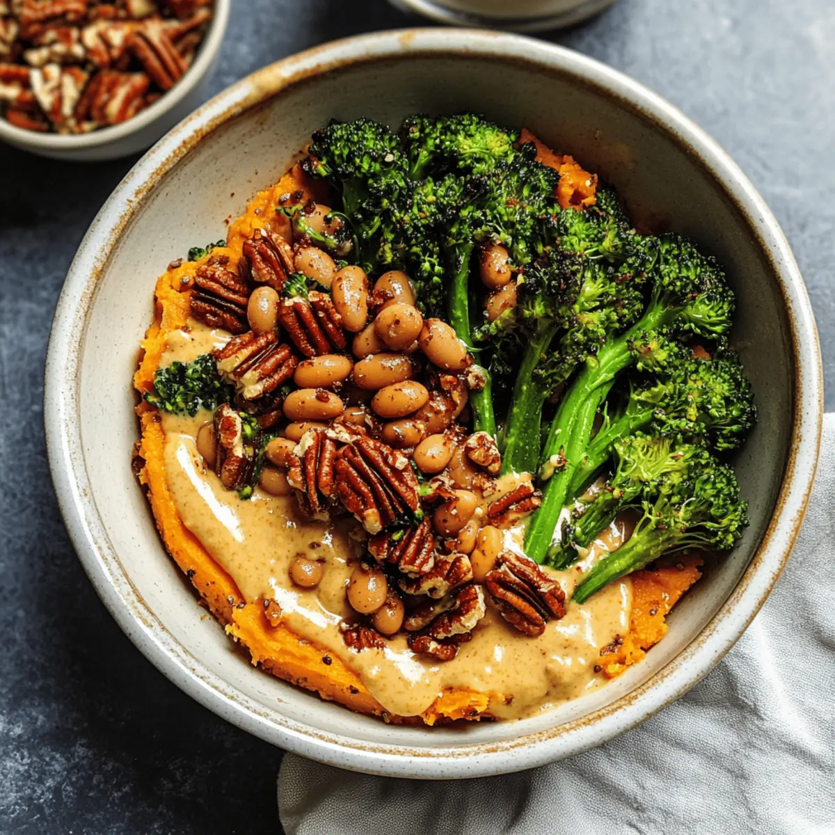 Aller à la recette Imprimer la recetteIl y a quelque chose de réconfortant dans l’idée d’un bol fumant de patates douces fouettées. Ce Bol de patates douces fouettées au tahini miso avec des haricots épicés et du broccolini est bien plus qu’un simple plat ; c’est un véritable câlin à chaque bouchée. Préparé avec des ingrédients sains et vibrants, ce repas est parfait pour ceux qui recherchent une alternative rapide et nourrissante aux plats à emporter. En quelques étapes simples, vous aurez un mélange crémeux de saveurs doux-amer, de légumes croquants et de protéines réconfortantes pour nourrir votre corps et votre âme. N’attendez plus, qu’attendez-vous pour découvrir cette explosion de goûts inutilement délicieuse ? Pourquoi ce bol est-il irrésistible ? Convivialité à son apogée : Ce bol de patates douces est parfait pour rassembler famille et amis autour d’un repas chaleureux. Saveurs riches : La combinaison de tahini miso et d’épices apporte une profondeur de goût inégalée. Simplicité : Avec des étapes faciles à suivre, même les novices en cuisine peuvent réaliser cette recette sans stress. Polyvalent : Customisez avec vos légumes ou haricots préférés pour un plat qui évolue avec vous ! Nutrition au rendez-vous : Rempli de vitamines et de fibres, il fait le bonheur des gourmands soucieux de leur santé. Envie de découvrir plus de délices sains ? Consultez notre guide sur les recettes végétaliennes délicieuses pour davantage d’inspiration. Ingrédients du Bol de Patates Douces Fouettées au Tahini Miso • Un bol nourrissant rempli de saveurs et de bienfaits. Pour les Patates Douces Patates Douces – Donnent une base crémeuse et douce ; vous pouvez les couper en dés et les faire bouillir pour gagner du temps (mais perdent un peu de ce goût grillé). Ail – Rehausse la saveur ; l’ail rôti est plus doux et sucré. Huile d’Olive (2 c. à soupe) – Ajoute richesse et humidité. Tahini (½ tasse) – Offre crémeux et saveur de noisette ; peut être remplacé par du beurre de tournesol ou un yaourt non laitier. Sirop d’Érable (1 c. à soupe) – Ajoute douceur pour équilibrer les saveurs salées. Pâte de Miso (2 c. à café) – Apporte une richesse umami ; peut être omise ou remplacée par du bouillon de légumes en cas d’allergie au miso. Cannelle (½ c. à café) – Ajoute chaleur et profondeur de saveur. Sel & Poivre – Essentiels pour assaisonner. Pour la Garniture Broccolini (2 bottes) – Apporte couleur, croquant et nutriments. Haricots Cannellini (15 oz) – Source de protéines et de consistance. Poudre d’Ail (1 c. à café), Poudre d’Oignon (1 c. à café), Paprika Fumé (½ c. à café), Sel (½ c. à café), Basilic Séché (¼ c. à café), Poivre Noir (¼ c. à café) – Assaisonnements qui rehaussent le mélange de légumes. Pour la Garniture Croquante Pécans (1 tasse) – Ajoutent croquant et saveur de noisette ; peuvent être remplacés par des graines de tournesol ou des pepitas. Pâte de Piment à l’Ail (1 c. à soupe) – Offre chaleur et saveur ; ajustez selon vos préférences. Vinaigre de Riz (1 c. à soupe) – Apporte une acidité à la garniture de pécans. Instructions pour le Bol de Patates Douces Fouettées au Tahini Miso avec des Haricots Épicés et du Broccolini Step 1: Préchauffage du four Préchauffez votre four à 200°C (400°F). Pendant que le four chauffe, tapissez une plaque de cuisson de papier sulfurisé pour éviter que les patates douces n’adhèrent. Cela garantit une cuisson uniforme et un nettoyage facile par la suite. Step 2: Rôtissage des patates douces Piquez les patates douces avec une fourchette à plusieurs endroits et placez-les sur la plaque préparée. Enfournez-les pendant 50 à 55 minutes, jusqu’à ce qu’elles soient tendres et qu’un couteau puisse y pénétrer facilement. Ce temps de cuisson permet d’obtenir une texture parfaitement crémeuse pour votre bol de patates douces fouettées. Step 3: Préparation de l’ail rôti Prenez une tête d’ail, coupez le sommet pour exposer les gousses, puis arrosez d’un peu d’huile d’olive. Assaisonnez avec du sel et du poivre, puis enveloppez l’ail dans du papier sulfurisé. Ajoutez-le au four 15 à 20 minutes avant la fin de la cuisson des patates douces pour qu’il devienne doux et caramélisé. Step 4: Sauter le broccolini Dans une poêle, faites chauffer 2 cuillères à soupe d’huile d’olive à feu moyen. Ajoutez les broccolini et faites-les sauter jusqu’à ce qu’ils soient légèrement carbonisés, ce qui prend environ 5 minutes. Pour les cuire à la vapeur ensuite, ajoutez un peu d’eau dans la poêle, couvrez et laissez cuire pendant environ 2 minutes. Step 5: Incorporation des haricots épicés Ajoutez les haricots cannellini, ainsi que la poudre d’ail, la poudre d’oignon, le paprika fumé, le sel, le basilic séché et le poivre dans la poêle avec le broccolini. Faites cuire le mélange pendant 3 à 4 minutes, en remuant régulièrement, jusqu’à ce que les haricots soient bien chauds et parfumés. Step 6: Préparation des pécans Dans une petite casserole à feu moyen, ajoutez les pécans et faites-les toaster pendant 2 à 3 minutes, en remuant constamment pour éviter qu’ils ne brûlent. Ensuite, incorporez le sirop d’érable, la pâte de piment à l’ail et le vinaigre de riz, puis laissez mijoter pendant 2 minutes avant de retirer du feu. Step 7: Mélange des patates douces Une fois les patates douces rôties, retirez-les du four, épluchez-les soigneusement et placez la chair dans un grand bol. Ajoutez les gousses d’ail rôties, le tahini, le sirop d’érable, la pâte de miso, la cannelle, le sel et le poivre. Écrasez le tout jusqu’à obtenir une texture lisse et crémeuse. Step 8: Assemblage du bol Pour finir, prenez des bols et commencez par ajouter une généreuse portion de la purée de patates douces fouettées au tahini miso au fond