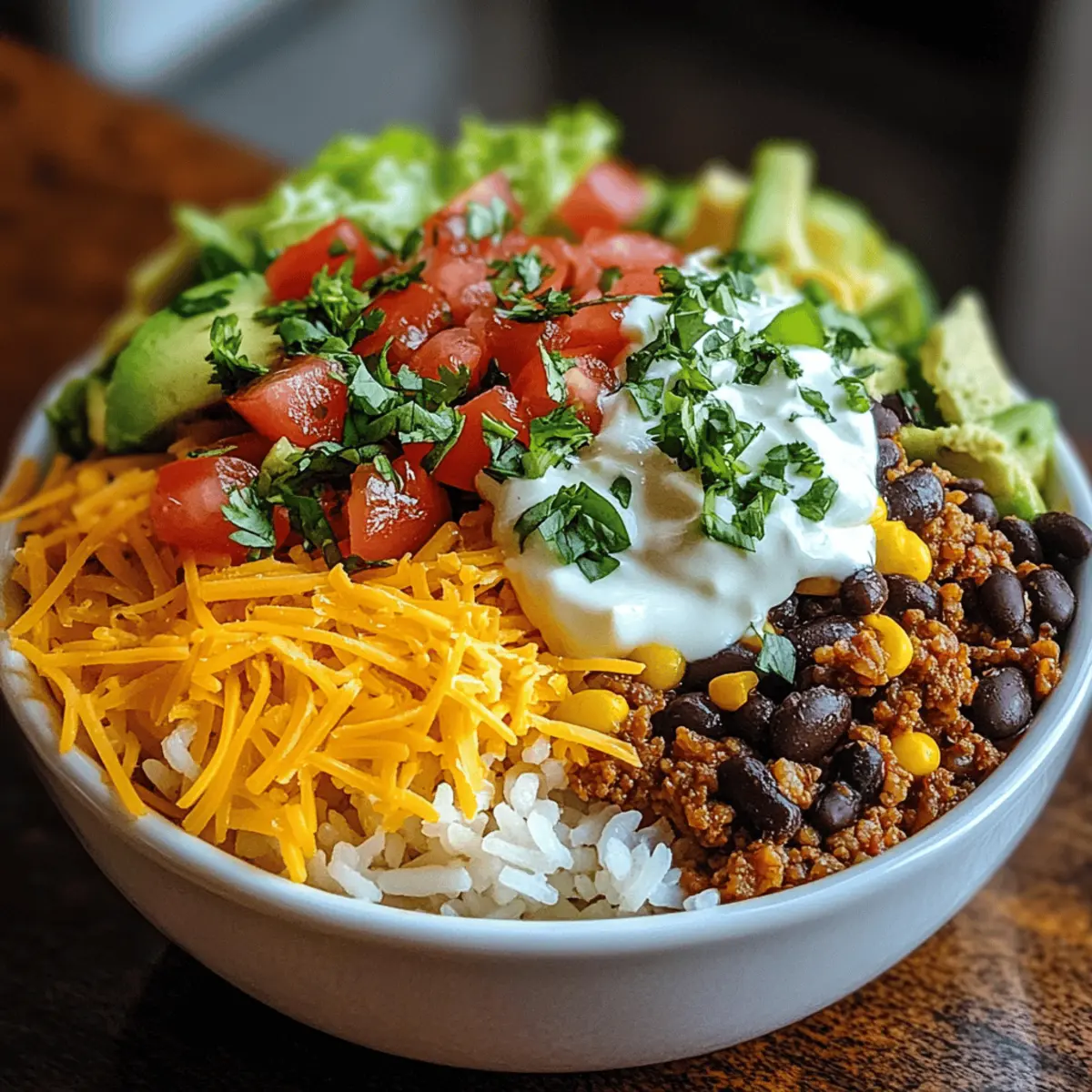Dans chaque bol, commencez par une généreuse couche de riz, suivie des haricots noirs bien chauds et de la viande assaisonnée. Disposez ensuite la laitue râpée, les tomates en dés, et le fromage cheddar râpé sur le dessus. Pour finir, arrosez de salsa et ajoutez des avocats en tranches pour une touche de fraîcheur et de crémeux.