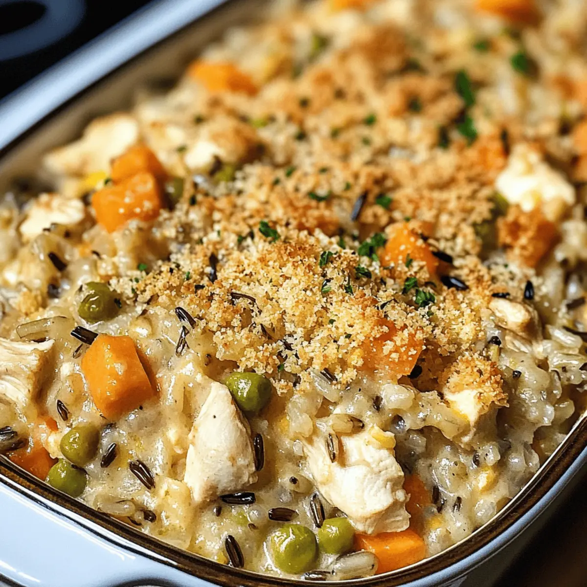 Aller à la recette Imprimer la recetteEn ouvrant mon réfrigérateur, mon regard s’arrête sur quelques restes de poulet et un paquet de riz sauvage. En un clin d’œil, l’idée d’une casserole de poulet au riz sauvage prend vie dans mon esprit. Cette recette réconfortante allie tendres morceaux de poulet, riz sauvage et légumes croquants, le tout enveloppé d’une sauce crémeuse et surmonté de croûtons de panko dorés. Non seulement cette casserole de poulet au riz sauvage est un vrai régal pour la famille, mais elle se prépare également en un rien de temps, parfait pour les soirs de semaine chargés! Avec ses possibilités de personnalisation, que ce soit en ajoutant des légumes de saison ou en jouant sur les épices, vous trouverez rapidement votre propre twist à cet incontournable de la cuisine maison. Alors, prêts à découvrir le secret de ce plat réconfortant qui ravira toutes vos papilles? Pourquoi choisir cette recette? Simplicité: La préparation est un jeu d’enfant; même les cuisiniers débutants peuvent réaliser cette casserole sans tracas. Saveurs riches: L’alliance du poulet tendre, du riz sauvage et de la sauce crémeuse offre une explosion de saveurs qui réchauffera votre cœur. Personnalisable: Ajoutez vos légumes de saison préférés ou variez les épices pour créer votre version unique. N’hésitez pas à consulter cette idée de saison pour une touche fraîche! Rapide: En moins d’une heure, vous aurez un plat savoureux qui plaira à toute la famille, idéal pour les soirs de semaine chargés. Attraction pour tous: Que ce soit lors d’un dîner en famille ou d’un potluck, cette casserole est un véritable succès qui ravira les gourmands. Ingrédients de la Casserole de Poulet au Riz Sauvage • Préparez-vous à découvrir les ingrédients essentiels qui font de cette casserole un plat incontournable! Pour la base Mélange de riz sauvage – Fournit des protéines et des fibres; vous pouvez le remplacer par du riz basmati ou brun. Poitrine ou cuisses de poulet – Source principale de protéines qui ajoute de la richesse; utilisez de la dinde pour une option plus légère. Pour les épices Sel, poivre, paprika – Équilibrent et rehaussent les saveurs; ajustez selon vos préférences. Huile d’olive – Idéale pour faire sauter; peut être remplacée par du beurre ou de l’huile d’avocat. Beurre non salé – Apporte de la richesse; l’huile d’olive peut être utilisée pour une version sans produits laitiers. Pour les légumes Oignon – Ajoute un arôme doux; remplacez par des échalotes pour une saveur plus douce. Céleri – Apporte du croquant; vous pouvez l’omettre si vous y êtes sensible. Carottes – Donnent de la couleur et de la douceur; échanger avec des panais pour une saveur plus terreuse. Ail – Indispensable pour la saveur; utilisez de la poudre d’ail si vous n’avez pas de frais. Champignons Baby Bella/Creamini – Offrent de l’umami; des champignons de Paris peuvent les remplacer. Pour la sauce Bouillon de poulet à faible teneur en sodium – Ajoute de l’humidité et de la saveur; le bouillon fait maison fonctionne aussi très bien. Fécule de maïs – Épaissit la sauce; peut être substituée par de la farine ou de la poudre de racine d’arrow-root. Lait – Apporte de la crémeux; utilisez du lait d’amande pour une alternative sans produits laitiers. Moutarde de Dijon, sauce Worcestershire – Rehaussent la complexité des saveurs; omettez pour un plat plus doux. Herbes séchées (persil, basilic, thym) – Ajoutent de la profondeur; des herbes fraîches peuvent être utilisées pour un goût plus fort. Fromage cheddar fort et parmesan – Offrent crémeux et saveur; n’importe quel fromage fort conviendra. Pour le croustillant Chapelure Panko – Pour une garniture croustillante; la chapelure ordinaire peut être une alternative. Instructions pour la Casserole de poulet au riz sauvage Step 1: Préchauffage et préparation Préchauffez votre four à 180°C (350°F) et préparez un plat de cuisson de 23×33 cm en le vaporisant d’un spray de cuisson. Cela évitera que votre casserole de poulet au riz sauvage n’attache au fond. Pendant que le four chauffe, vous pouvez préparer les autres ingrédients et les avoir à portée de main. Step 2: Assaisonnement et saisie du poulet Assaisonnez les morceaux de poulet avec du sel, du poivre et du paprika. Faites chauffer de l’huile d’olive dans une grande poêle à feu moyen, puis ajoutez le poulet. Faites cuire chaque côté pendant environ 4 à 5 minutes, jusqu’à ce qu’il soit légèrement doré, mais pas entièrement cuit. Retirez-le de la poêle et réservez. Step 3: Sauté des légumes Dans la même poêle, ajoutez les oignons, les carottes et le céleri. Faites sauter à feu moyen pendant environ 5 à 7 minutes jusqu’à ce que les légumes soient tendres. Ajoutez ensuite l’ail et faites cuire encore pendant 1 minute, en remuant fréquemment pour éviter de brûler l’ail. Step 4: Caramélisation des champignons Ajoutez le beurre dans la poêle et laissez-le fondre. Ajoutez les champignons et faites-les sauter pendant environ 5 à 7 minutes, jusqu’à ce qu’ils soient bien dorés et caramélisés. Cela apportera beaucoup de saveur à la casserole de poulet au riz sauvage. Incorporez les légumes sautés puis retirez du feu. Step 5: Préparation de la sauce crémeuse Dans une petite casserole, faites fondre le reste du beurre à feu moyen. Ajoutez la fécule de maïs, fouettez pendant environ 1 minute, puis intégrez progressivement le bouillon de poulet et le lait. Continuez à fouetter jusqu’à ce que la sauce épaississe, environ 5 minutes. Incorporez la moutarde de Dijon, la sauce Worcestershire et les fromages jusqu’à ce qu’ils soient fondus. Step 6: Assemblage de la casserole Dans un grand bol, combinez le poulet cuit, le mélange de légumes et le riz sauvage. Versez la sauce crémeuse par-dessus et mélang