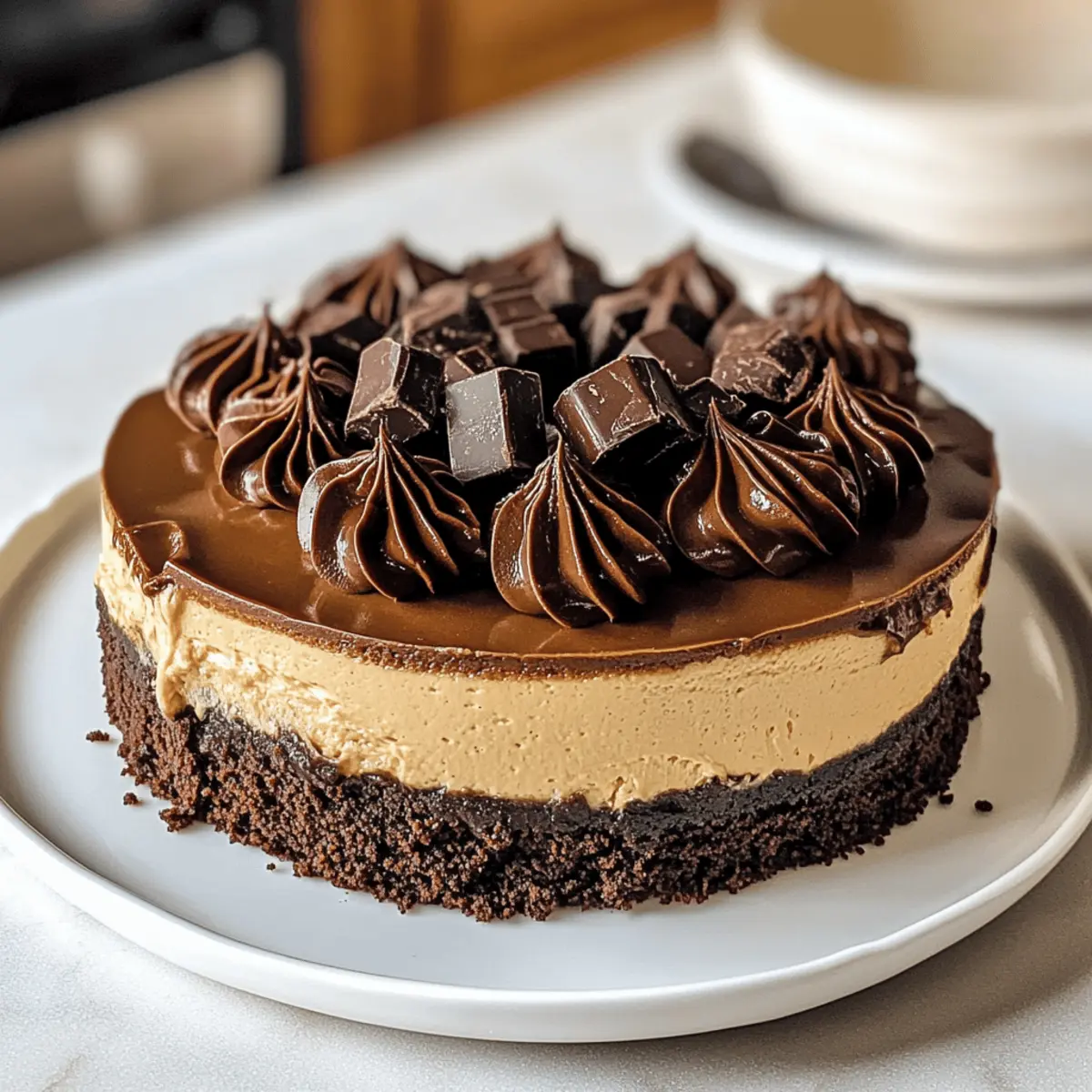 Aller à la recette Imprimer la recetteEn savourant une délicieuse tasse de café ce matin, une pensée m’est venue : pourquoi ne pas combiner ce breuvage réconfortant avec un dessert tout aussi irrésistible? Voilà comment j’ai décidé de préparer ce Gâteau au fromage brownie au café, une merveille qui épousera parfaitement les saveurs riches et crémeuses de la cheesecake au café avec la texture dense et foncée d’une fondante base de brownie. Ce dessert est non seulement rapide à réaliser, mais il fera toujours sensation lors de vos rassemblements entre amis ou en famille. Avec sa ganache au chocolat café et sa décoration ludique, il pourrait faire de votre prochaine occasion une véritable célébration. Qui pourrait résister à une telle gourmandise? Pourquoi ce gâteau au fromage au café? Délicieuse combinaison : Ce Gâteau au fromage brownie au café marrie le meilleur des deux mondes : le goût intense du café et le moelleux d’un brownie. Facilité d’exécution : Pas besoin d’être un chef pour réaliser cette recette; elle est accessible à tous, avec des étapes simples et des ingrédients que l’on trouve facilement dans votre cuisine. Polyvalence incroyable : Vous pouvez personnaliser ce dessert à l’infini, que ce soit avec des fruits frais comme une compote, ou en jouant avec les saveurs de la cheesecake. Attrait irrésistible : Que ce soit pour un brunch entre amis ou un dîner intime, ce gâteau impressionne à chaque fois ! N’oubliez pas de l’accompagner d’une tasse de café ou d’une boule de glace vanille pour le plaisir ultime. Idée de stockage : Préparez ce délice à l’avance, il se conserve une semaine au réfrigérateur, donc laissez-vous le temps d’en profiter sans stress, tout comme avec des recettes inspirantes comme nos crêpes courgettes fromage ou rillettes radis roses fromage. Ingrédients du Gâteau au fromage brownie au café • Pour réaliser cette délicieuse recette, voici la liste des ingrédients nécessaires. Pour la base de brownie Beurre (3/4 tasse, en cubes) – Ajoute de la richesse à la base; vous pouvez utiliser de la margarine pour une version sans produits laitiers. Sucre brun clair (1/2 tasse, tassé) – Confère humidité et profondeur; peut être remplacé par du sucre blanc. Farine tout usage (3/4 tasse) – Donne de la structure au brownie; un substitut sans gluten peut convenir. Cacao en poudre non sucré (1/2 tasse) – Renforce le goût chocolaté; évitez les types sucrés. Sel (1/4 cuillère à café) – Rehausse les saveurs; omettez-le si vous surveillez votre consommation de sodium. Œufs (3 grands + 1 jaune, à température ambiante) – Lient le tout; l’aquafaba peut servir d’alternative végétalienne. Pour la garniture au fromage Fromage à la crème (24 oz, ramolli) – Produit la garniture crémeuse; assurez-vous qu’il soit à température ambiante pour un mélange lisse. Sucre granulé (1 tasse) – Sucre la garniture; le sucre brun peut apporter une note de mélasse. Maïzena (1 cuillère à soupe) – Stabilise la cheesecake, prévenant les fissures; peut être omise mais le résultat sera plus mou. Crème aigre (1/2 tasse, à température ambiante) – Apporte de la crémeux à la cheesecake; le yaourt nature peut remplacer. Granules de café instantané – Donnent le goût de café; remplacer par du café infusé pour une saveur différente. Crème épaisse (1 tasse) – Pour la garniture fouettée; peut être substituée par une garniture fouettée non laitière. Pour la ganache Chocolat noir (5 oz, haché) – Base de la ganache; la qualité affecte le goût; du chocolat semi-sucré peut être une alternative. Chips de chocolat noir (1.5 tasse) – Pour créer une ganache délicieuse; remplacez par du chocolat au lait pour une saveur plus douce. Graisse végétale (1 cuillère à soupe) – Aide à fixer la ganache; l’huile de noix de coco peut être utilisée à la place. Crème épaisse (1 tasse) – Pour créer la ganache; ne la remplacez pas par du lait, cela altérerait la texture. Chacun de ces ingrédients contribue à faire de votre gâteau au fromage brownie au café un délice irrésistible. Préparez-vous à épater vos invités! Step-by-Step Instructions for Gâteau au fromage brownie au café Step 1: Préchauffez le four Préchauffez votre four à 180°C (350°F). Pendant ce temps, préparez un moule à charnière de 23 cm en tapissant le fond de papier sulfurisé et en vaporisant les côtés avec un spray anti-adhésif. Cela aidera à démouler facilement votre Gâteau au fromage brownie au café une fois qu’il aura terminé la cuisson. Step 2: Préparez la base de brownie Dans un bain-marie, faites fondre le beurre jusqu’à ce qu’il soit complètement liquide. Ajoutez le sucre brun clair et mélangez jusqu’à obtention d’une consistance lisse, environ 5 minutes. Une fois incorporés, retirez du feu et laissez légèrement refroidir. Cela garantira que la base de brownie soit riche et moelleuse. Step 3: Incorporez les œufs et les ingrédients secs Ajoutez les œufs et l’extrait de vanille à votre mélange refroidi. Fouettez jusqu’à ce que le mélange soit homogène. Tamisez la farine et le cacao en poudre au-dessus de la préparation, puis incorporez délicatement, à l’aide d’une spatule, jusqu’à ce qu’aucune trace de farine ne soit visible. Step 4: Cuisson de la base de brownie Versez la pâte à brownie dans le moule préparé et lissez le dessus avec une spatule. Enfournez pendant 20 à 25 minutes, ou jusqu’à ce qu’un testeur inséré au centre en ressorte avec quelques miettes humides. Laissez refroidir la base sur une grille pendant que vous préparez la garniture au fromage. Step 5: Préparez le bain-marie Avant de préparer la garniture au fromage, créez un bain-marie. Enveloppez le fond du moule à charnière avec du papier d’aluminium pour éviter les fuites, puis placez-le dans un grand plat allant au 