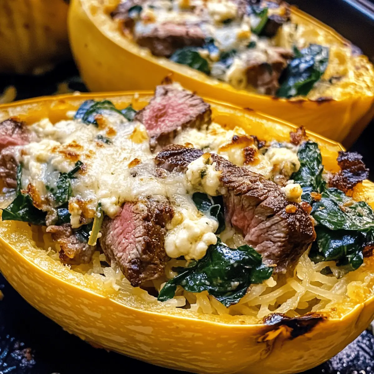 Dans un grand bol, mélangez les tranches de steak avec 3/4 tasse d’épinards, 1/4 de tasse de tomates séchées, et 1/2 tasse de sauce Alfredo réservée. Remplissez généreusement chaque moitié de courge avec ce mélange. Ajoutez quelques morceaux de fromage gorgonzola sur le dessus pour une touche crémeuse supplémentaire.