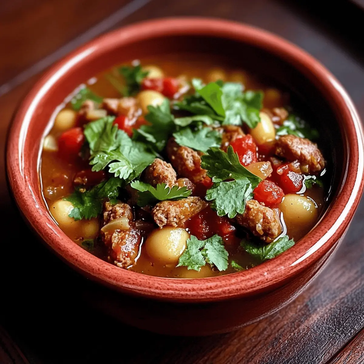 Aller à la recette Imprimer la recette« Tu as déjà eu ce moment où l’odeur alléchante d’un plat réconfortant t’envahit dès que tu ouvres la porte de ta cuisine ? C’est exactement ce qui m’est arrivé en préparant ce Posole épicé à la saucisse. Avec juste cinq ingrédients, cette recette rapide et facile promet un dîner savoureux qui séduira toute la famille en moins de 35 minutes. Imagine un mélange irrésistible de saucisse de porc épicée, de hominy moelleux et de tomates rôties au feu, créant une soupe qui réchauffe le cœur. La meilleure partie ? C’est un plat sans gluten qui ravira même ceux qui cherchent à éviter les repas rapides et sans saveur. Prêts à plonger dans ce moment réconfortant ? Alors, que diriez-vous d’ajouter votre touche personnelle en garnissant votre bol de crème aigre et de croustillantes chips de tortilla ? » Pourquoi aimer cette recette de posole ? Simplicité : Avec seulement cinq ingrédients, cette recette est incroyablement facile à préparer, parfaite pour les soirées chargées. Saveurs riches : Le mélange de saucisse épicée et de tomates rôties offre une profondeur de goût qui séduira tous les palais. Options variées : Que tu choisisses de remplacer la saucisse par des protéines végétales ou d’ajouter des légumes comme des poivrons, les possibilités sont infinies pour diversifier ta cuisine ! Économie de temps : En moins de 35 minutes, tu peux préparer un plat réconfortant et savoureux qui ravira ta famille. Attractif pour tous : Ce posole épicé est une excellente alternative aux plats rapide, idéal pour tous ceux qui recherchent un dîner réconfortant et familial. Ingrédients du posole épicé à la saucisse • Pour le bouillon Saucisse de porc hachée – Apporte une base protéinée et une saveur robuste. Remplace-la par de la saucisse de poulet pour une option plus légère. Mélange d’épices pour tacos – Ajoute des notes épicées et savoureuses ; un mélange fait maison peut offrir un meilleur contrôle sur la saveur. Tomates rôties au feu (2 boîtes de 400 g) – Ajoute douceur et profondeur ; crée une base riche pour la soupe. Les tomates en dés ordinaires peuvent être substituées, mais la saveur variera. Eau (400 ml) – Utilisée pour ajuster la consistance de la soupe. Utiliser du bouillon de poulet ou de légumes peut rehausser la saveur. Hominy blanc (625 ml) – Contribue une texture légèrement moelleuse et sert de garniture copieuse. Peut être remplacé par du maïs en conserve en cas d’urgence. • Pour les garnitures Coriandre fraîche (125 ml, tassée) – Améliore la fraîcheur et ajoute un arôme herbacé. Omettre si le goût de la coriandre n’est pas souhaité. Crème aigre (pour le service) – Ajoute une onctuosité qui équilibre le piquant. Le yaourt grec peut être une alternative plus saine. Chips de tortilla (pour le service) – Apporte du croquant et de la texture. Pense à utiliser des chips cuites au four pour une option plus légère. Profite de chaque cuillerée de ce délicieux posole épicé à la saucisse, prêt en seulement 35 minutes ! Instructions pour le Posole épicé à la saucisse Step 1: Cuire la saucisse Dans une grande casserole, fais chauffer à feu moyen la saucisse de porc hachée avec le mélange d’épices pour tacos pendant environ 5 à 7 minutes. Utilise une cuillère en bois pour émietter la saucisse et la cuire jusqu’à ce qu’elle soit bien dorée. Une fois cuite, égoutte l’excès de graisse pour éviter un plat trop gras. Step 2: Combiner les ingrédients Remets la saucisse dans la casserole et ajoute les tomates rôties au feu, l’eau et le hominy. Remue bien la préparation à l’aide d’une spatule en bois pour bien mélanger tous les ingrédients. Porte le mélange à une légère ébullition, puis réduis le feu à moyen-doux pour laisser mijoter. Step 3: Laisser mijoter Laisse le posole mijoter pendant 10 à 15 minutes, en remuant de temps en temps. Tu verras la soupe épaissir légèrement et les saveurs se mélanger. À ce stade, assure-toi que tout est bien chaud et que les arômes se dégagent de la casserole, indiquant que le plat est presque prêt. Step 4: Servir Juste avant de servir, incorpore la coriandre fraîche pour ajouter une touche de fraîcheur. À l’aide d’une louche, répartis le posole épicé à la saucisse dans des bols. Pour une touche finale, garnis ton plat de crème aigre et de chips de tortilla croustillantes selon tes préférences. Conseils de conservation pour le posole épicé à la saucisse Réfrigérateur : Conserve le posole épicé à la saucisse dans un récipient hermétique au réfrigérateur jusqu’à 3 jours. Cela permet aux saveurs de se développer encore plus. Congélateur : Si tu souhaites le conserver plus longtemps, le posole peut être congelé jusqu’à 2 mois. Veille à le placer dans des sacs de congélation pour éviter les brûlures de congélation. Réchauffage : Pour réchauffer, fais chauffer doucement à feu moyen sur la cuisinière, en ajoutant un peu d’eau ou de bouillon si nécessaire pour ajuster la consistance. Ajouts frais : Ajoute de la coriandre fraîche juste avant de servir à chaque réchauffage pour un goût éclatant. Variations de la recette de posole épicé Personnalise ton expérience culinaire en ajoutant ta touche personnelle à cette recette réconfortante ! Option végétarienne : Remplace la saucisse par des morceaux de soja et utilise du bouillon de légumes pour une version 100% veggie. Ce changement permet d’explorer de nouvelles saveurs tout en restant copieux. Substitution de protéines : Utilise du poulet ou de la dinde effilochée à la place de la saucisse pour une alternative plus légère et tout aussi délicieuse. Ajoute quelques épices pour obtenir le même goût réconfortant. Ajout de légumes : Incorpore des poivrons ou des courgettes en dés pour plus de couleurs et de nutriments, tout en rehaussa