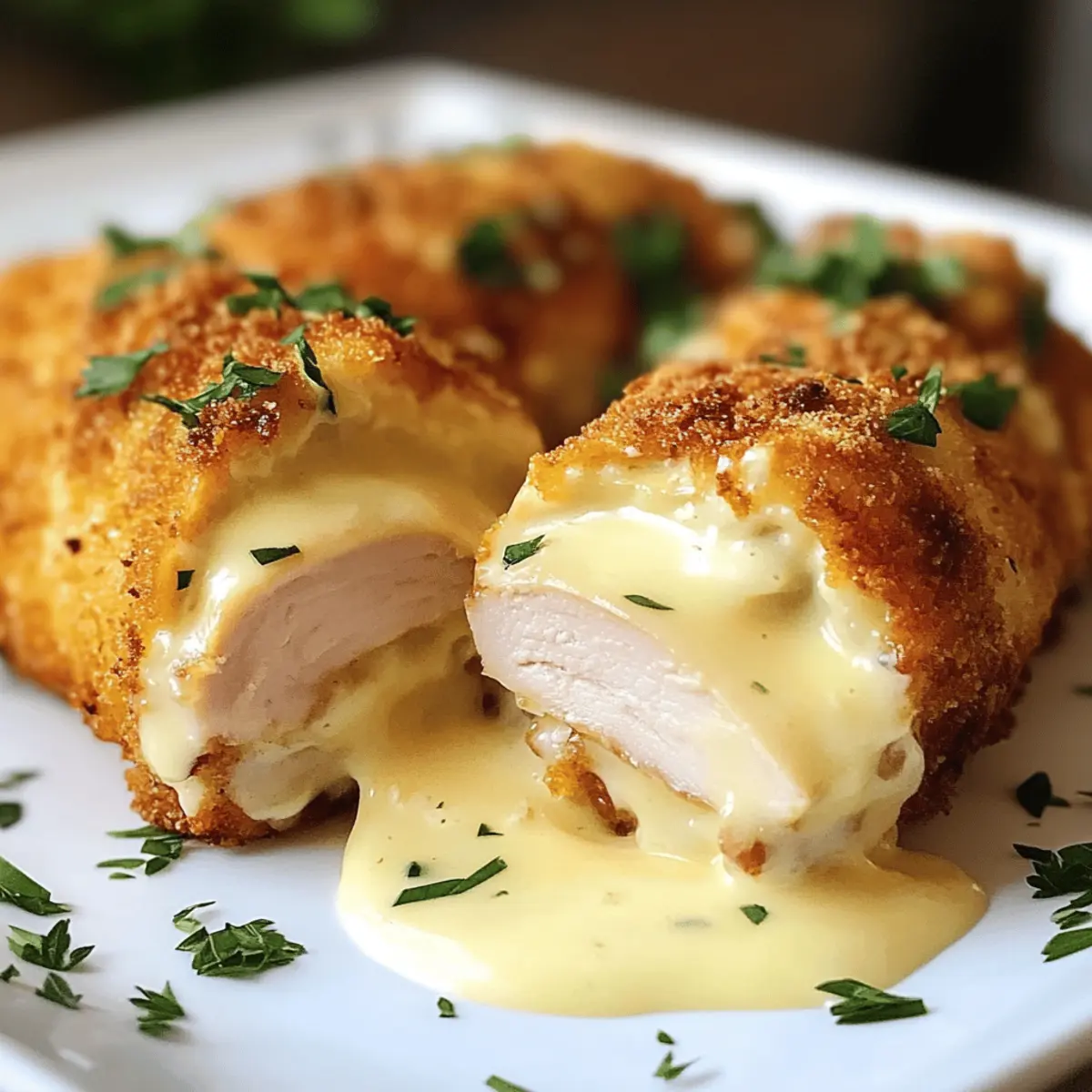 Aller à la recette Imprimer la recetteChaque bouchée de ce Poulet Cordon Bleu avec Sauce au Fromage Suisse est une invitation à un voyage gustatif qui éveille des souvenirs de repas chaleureux en famille. Cette recette, à la fois simple et raffinée, allie le tendre poulet et le délicieux dinde, enveloppés dans une croûte dorée qui renferme un cœur crémeux de fromage suisse. Non seulement elle est sans gluten, mais elle se prépare rapidement, faisant d’elle un choix idéal pour les soirs où le temps presse. Que vous souhaitiez impressionner vos convives ou vous faire plaisir après une longue journée, cette version du classique Cordon Bleu saura ravir vos papilles et apporter du réconfort dans votre assiette. Avez-vous déjà pensé à combiner des saveurs aussi exquises dans votre cuisine? Pourquoi essayer cette recette savoureuse ? Simplicité, la recette du Poulet Cordon Bleu est accessible à tous, même aux débutants en cuisine. Saveurs exquises, la combinaison de dinde et de fromage suisse crée un mélange crémeux et délicat à chaque bouchée. Rapide à préparer, vous pourrez régaler vos invités en moins d’une heure, sans sacrifier le goût. Polyvalence est au rendez-vous, avec des options pour personnaliser la recette selon vos envies. Pour un accompagnement délicieux, n’hésitez pas à essayer cette salade de haricots verts au poulet qui apportera une touche de fraîcheur à votre repas. Ingrédients du Poulet Cordon Bleu • Pour réaliser un plat mémorable de Poulet Cordon Bleu avec Sauce au Fromage Suisse, voici les ingrédients essentiels : Pour le Poulet Poitrines de poulet – Utilisez des poitrines désossées pour faciliter le roulage. Tranches de dinde – Ajoute une saveur savoureuse ; vous pouvez les remplacer par du jambon pour une variante. Pour la Panure Farine – Sert à enrober le poulet ; choisissez de la farine sans gluten si nécessaire. Œufs – Ils permettent de lier la panure ensachée. Chapelure – Pour un enrobage croustillant, optez pour de la chapelure sans gluten en substitution. Pour la Sauce au Fromage Beurre – Pour faire cuire et préparer la sauce au fromage. Lait – Apporte de l’humidité à la sauce ; des alternatives sans produits laitiers fonctionnent aussi. Fromage suisse – Pour une onctuosité incomparable et un goût riche ; le Gruyère peut être utilisé comme substitution. Épices et Assaisonnements Ail en poudre – Pour rehausser la saveur de la panure ; l’ail frais peut intensifier encore plus le goût. Sel & Poivre – Indispensables pour l’assaisonnement, ajustez selon votre préférence personnelle. Avec ces ingrédients, vous êtes bien équipé pour préparer un délicieux Poulet Cordon Bleu qui ravira vos papilles et celles de vos convives. Instructions pour le Poulet Cordon Bleu avec Sauce au Fromage Suisse Step 1: Préchauffer le four Préchauffez votre four à 190°C (375°F) pour assurer une cuisson uniforme du Poulet Cordon Bleu. Pendant que le four chauffe, préparez votre plan de travail pour vous faciliter la tâche pour les étapes suivantes. Avoir tous vos ingrédients à portée de main vous aidera à ne rien oublier. Step 2: Préparer le poulet À l’aide d’un rouleau à pâtisserie ou d’un maillet à viande, aplatissez les poitrines de poulet entre deux feuilles de film alimentaire jusqu’à obtenir une épaisseur d’environ 1,3 cm (1/2 pouce). Cela permettra un roulage facile et garantira que le poulet cuise uniformément. Vous devriez obtenir des morceaux de poulet plats, prêts à être garnis. Step 3: Assembler les roulés Déposez une tranche de dinde et un morceau de fromage suisse sur chaque poitrine de poulet aplatie. Enroulez fermement le poulet autour de la garniture, puis fixez chaque roulé avec des cure-dents pour éviter qu’ils ne s’ouvrent durant la cuisson. Cela créera de délicieuses bouchées savoureuses au cœur crémeux. Step 4: Préparer la station de panure Créez une station avec trois assiettes : une avec de la farine assaisonnée, une autre avec un mélange d’œufs battus et de lait, et une dernière avec de la chapelure assaisonnée. Cela vous permettra de paner facilement vos morceaux de poulet tout en assurant un enrobage uniforme et croustillant pour votre Poulet Cordon Bleu. Step 5: Enrober le poulet Trempez chaque roulé de poulet dans la farine, puis dans le mélange d’œufs, et enfin dans la chapelure. Assurez-vous que chaque rouleau est complètement enrobé, en appuyant légèrement pour que la chapelure adhère bien. Cela garantit une croûte dorée et croustillante qui se marie parfaitement avec le fromage et la dinde fondants. Step 6: Faire dorer les roulés Dans une grande poêle, faites fondre une noix de beurre à feu moyen. Ajoutez les roulés de poulet et faites-les cuire pendant 4 à 5 minutes de chaque côté, jusqu’à ce qu’ils soient bien dorés et croustillants. Cela donnera une belle couleur et une texture irrésistible avant de les enfourner. Step 7: Cuisson au four Transférez les roulés de poulet dans un plat de cuisson et enfournez-les dans le four préchauffé. Laissez cuire pendant 20 à 25 minutes, ou jusqu’à ce que la température interne atteigne 75°C (165°F). Cela garantira que le poulet est bien cuit tout en permettant à la garniture de fondre à l’intérieur. Step 8: Préparer la sauce au fromage Dans une casserole à feu moyen, faites fondre 2 cuillères à soupe de beurre. Incorporez 2 cuillères à soupe de farine et fouettez jusqu’à obtenir un roux. Ajoutez progressivement le lait en continuant de fouetter, puis incorporez le fromage suisse jusqu’à ce qu’il soit fondu et lisse. Cette sauce crémeuse accompagnera parfaitement votre Poulet Cordon Bleu. Step 9: Servir Une fois les roulés cuits, retirez-les du four et laissez-les reposer quelques minutes. Coupez-les en tranches pour révéler le mélange savoureux de dinde et de fromage. Arrosez généreusement les tranches de