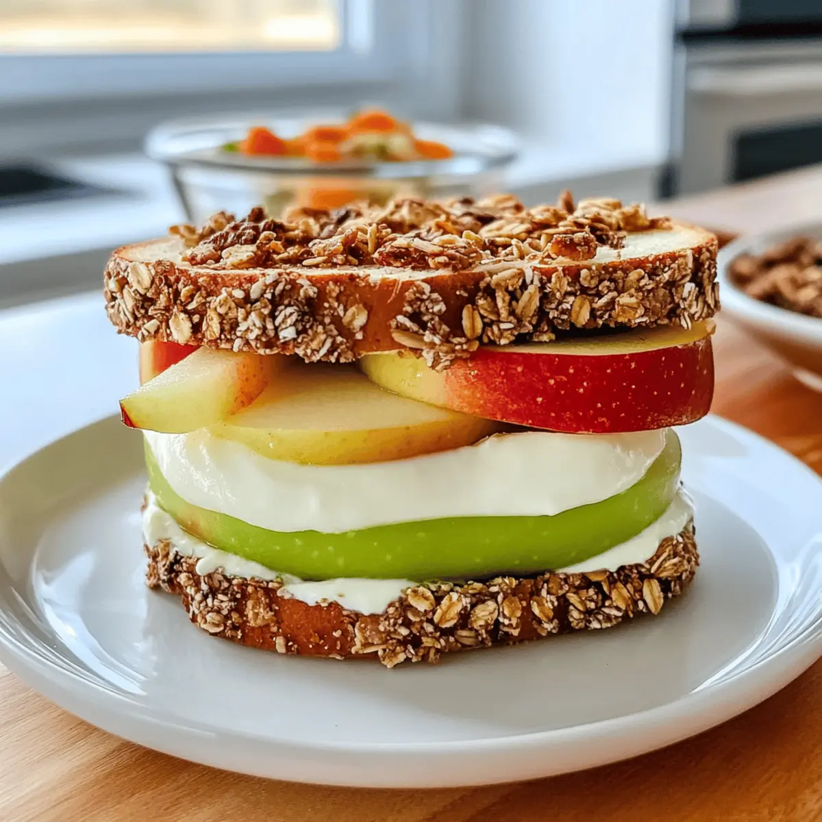 Savourez un sandwich de pomme croustillante avec granola et yaourt, une collation saine et délicieuse à préparer rapidement.