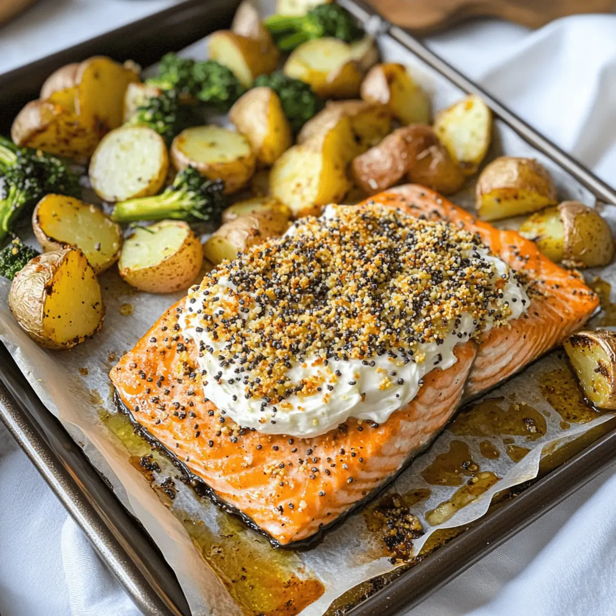 Aller à la recette Imprimer la recetteIl y a quelque chose de réconfortant à savoir que l’on peut préparer un dîner délicieux dans un seul plat tout en savourant des saveurs qui rappellent les classiques de la cuisine. Voici ma recette de Saumon sur plaque à pâtisserie avec bagel, une merveilleuse fusion entre le goût riche du saumon et l’irrésistible assaisonnement Everything Bagel. En moins d’une heure, ce repas sain vous permettra de réunir votre famille autour d’une table pleine de couleurs et de bonnes odeurs. Avec des légumes rôtis qui apportent croquant et couleur, ainsi qu’une option de crème fromagère pour une touche crémeuse, vous ne serez pas déçu. Que diriez-vous de découvrir le plaisir d’un dîner rempli de saveurs réconfortantes et de textures variées ? Pourquoi aimer cette recette ? Simplicité incroyable : Préparation rapide en seulement 30 minutes avec un seul plat à nettoyer ! Saveurs irrésistibles : Le mélange de saumon et d’assaisonnement Everything Bagel offre une explosion de goût à chaque bouchée. Options polyvalentes : Changez facilement les légumes selon vos préférences ou les saisons, ou optez pour un fromage crémeux différent. Attraction familiale : Ce plat plaira à toute la famille, des enfants aux adultes, rendant vos dîners encore plus joyeux. Repas sain : Riche en oméga-3, le saumon est un choix nutritif qui comblera vos envies de bien manger. Préparation à l’avance : Marinez le saumon quelques heures avant pour des saveurs encore plus profondes. Pour une salade fraîche à servir avec, consultez nos conseils sur la préparation de salades. Ingrédients pour Saumon sur plaque à pâtisserie avec bagel • Note : Préparez facilement cette recette en un seul plat, parfaite pour un dîner rapide. Pour le saumon • Saumon – Utilisez du saumon frais, peau sur ou sans peau selon vos préférences. • Crème fromagère légère – Ajoute une texture crémeuse et une belle saveur ; vous pouvez remplacer par du fromage de chèvre pour une option moins acide. Pour les légumes • Pommes de terre baby – Offrent du cœur au plat ; coupez-les en morceaux plus petits pour une cuisson plus rapide. • Légumes frais (haricots verts français, brocoli ou asperges) – Ajoutent de la couleur et de la valeur nutritionnelle ; choisissez selon votre goût. Assaisonnements • Tout sauf l’assaisonnement bagel – L’élément clé de saveur, mélange de graines de sésame, graines de pavot, ail et oignon ; ajustez les quantités selon vos envies. • Huile d’olive – Essentielle pour arroser vos légumes avant de les rôtir ; ajoutez-y de l’ail en poudre ou de l’aneth pour plus de goût. • Sel marin et poivre noir – Soulignent les saveurs générales ; n’hésitez pas à ajuster selon vos préférences. Profitez de votre repas en famille avec ce savoureux saumon sur plaque à pâtisserie avec bagel, un plat qui allie rapidité et délicieuses saveurs ! Instructions pour Saumon sur plaque à pâtisserie avec bagel Step 1 : Préchauffage du four Préchauffez votre four à 180 °C (350 °F). Cela garantit que votre saumon sur plaque à pâtisserie avec bagel sera cuit uniformément et rapidement. Pendant que le four chauffe, préparez tous vos ingrédients pour le rendre encore plus simple et rapide. Step 2 : Préparation de la plaque Tapissez une plaque à pâtisserie de papier sulfurisé pour un nettoyage facile. Assurez-vous que la surface est bien couverte, ce qui aidera à éviter que le saumon et les légumes ne collent. Cela rend également le service plus agréable lorsque vous servirez ce délicieux plat. Step 3 : Préparation du saumon Placez le saumon au centre de la plaque et séchez-le avec du papier absorbant. Cela permettra à la crème fromagère de mieux adhérer au saumon. Une fois sec, passez à l’étape suivante pour le rendre encore plus savoureux avec la crème. Step 4 : Ajout de la crème fromagère Étalez uniformément la crème fromagère légère sur le saumon à l’aide d’une spatule ou d’un couteau. Veillez à bien couvrir toute la surface pour garantir que chaque bouchée soit crémeuse et délicieuse. Cela ajoute une texture sublime à votre saumon sur plaque à pâtisserie avec bagel. Step 5 : Assaisonnement Saupoudrez généreusement l’assaisonnement Everything Bagel sur le saumon. Cela apportera une explosion de saveurs allant de l’ail aux graines de sésame, rehaussant le goût de votre plat. Assurez-vous que chaque partie du saumon est bien couverte pour une saveur optimale. Step 6 : Préparation des légumes et des pommes de terre Disposez les pommes de terre coupées en deux et les légumes frais autour du saumon. Choisissez des légumes colorés comme le brocoli ou les haricots verts pour une belle présentation. Cela équilibrera le plat tout en ajoutant des nutriments importants à votre repas. Step 7 : Assaisonnement des légumes Arrosez d’huile d’olive et saupoudrez de sel marin et de poivre noir sur les légumes et les pommes de terre. Cela permet de rehausser les saveurs de chaque ingrédient. Mélangez légèrement pour vous assurer que tout est bien enrobé avant de mettre le tout au four. Step 8 : Cuisson au four Enfournez la plaque à pâtisserie dans le four préchauffé et faites cuire pendant 20 à 25 minutes. Vérifiez la cuisson : le saumon doit être opaque et se détacher facilement à la fourchette, tandis que les légumes doivent être tendres mais encore croquants. Cela protégera la texture et le goût de votre saumon. Step 9 : Service Une fois cuit, sortez le plat du four et servez immédiatement. Laissez les couleurs et les arômes vous envoûter alors que vous savourez ce saumon sur plaque à pâtisserie avec bagel. Profitez de chaque bouchée avec votre famille, car ce plat réunit délicieux saveurs et moments agréables. Préparation à l’avance pour le Saumon sur plaque à pâtisserie avec bagel Préparez votre Saumon sur