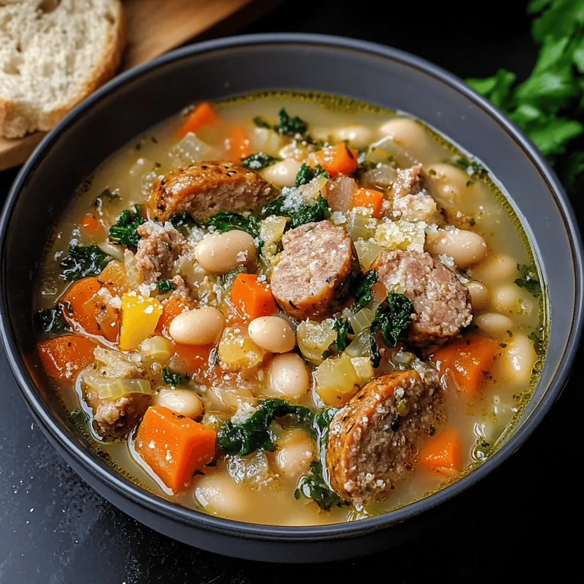 Une soupe réconfortante à base de saucisses italiennes et haricots blancs, parfaite après une longue journée.